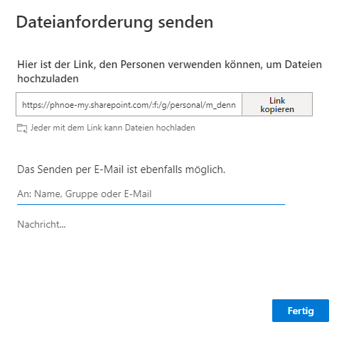 Hinweis: Damit diese Funktion Verfügbar wird, muss dein Administrator das Feature Anforderungsdateien aktivieren (Enable File Requests in SharePoint or OneDrive – SharePoint in Microsoft 365 | Microsoft Learn)