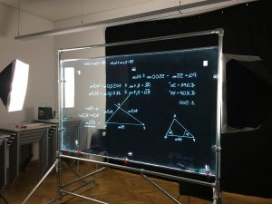 Was ist ein Lightboard? Dabei handelt es sich um eine „Tafel“ aus Glas, die beleuchtet ist. Somit kann man an der „Tafel“ schreiben und gleichzeitig in eine Kamera schauen. Wichtig ist dabei auch, dass der Raum verdunkelt wird, damit man keine Spiegelungen im Glas hat. (Genaue Anleitungen zum Bauen eines Lightboards findet man im Internet.)