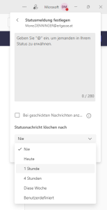 • Festlegen einer Dauer für Ihre Anwesenheit: Ändern Sie Ihre Verfügbarkeit in Teams für einen bestimmten Zeitraum. Wählen Sie Ihr Profilbild in Teams aus, wählen Sie Dauer und dann Ihren Status und aus, wann es zurückgesetzt werden soll.